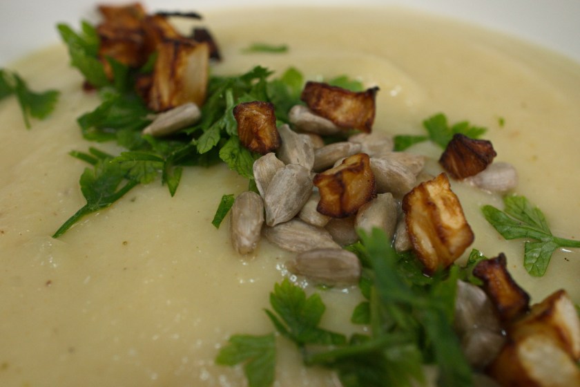 Cremige Selleriesuppe mit Sellerie-Croutons & gerösteten Sonnenblumenkernen – vegane Selleriecremesuppe