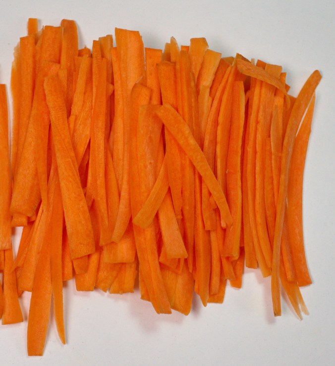 Weißkohl putzen, den Strunk entfernen und den Kohl sehr fein hobeln. Karotten schälen und in dünne Streifen schneiden. Shiitakepilze putzen und ebenso in Streifen schneiden. Petersilie waschen, trockenschleudern, grob zerhacken und beiseite stellen. Zitrone und Orange jeweils auspressen und beiseite stellen.
