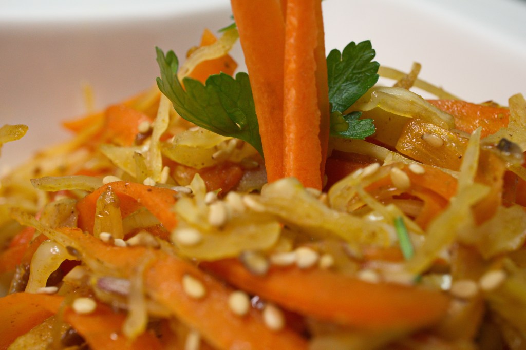 Gemüse unter ständigem Wenden 5 Minuten anbraten. Die gerösteten Gewürze dazugeben. Mit einem kräftigen Schuss Sojasoße, Zitronen- und Orangensaft ablöschen und gut verrühren. Petersilie und Schwarzkümmel zu dem Gemüse geben und unterheben. Zum Schluss mit dem gerösteten Sesam bestreuen. Als Beilage empfehle ich Duftreis.