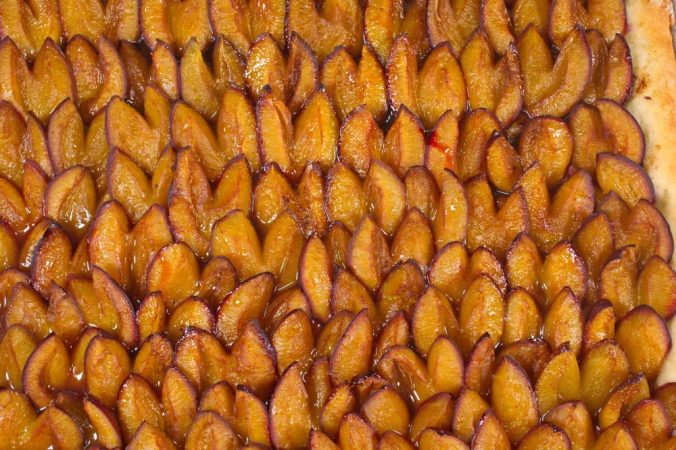 Backblech mit Backpapier belegen. Den Teig auf einer bemehlten Arbeitsfläche auf Blechgröße ausrollen, um das Nudelholz „wickeln“ und auf das Blech legen und mit dem dem Pflaumenmus bestreichen.