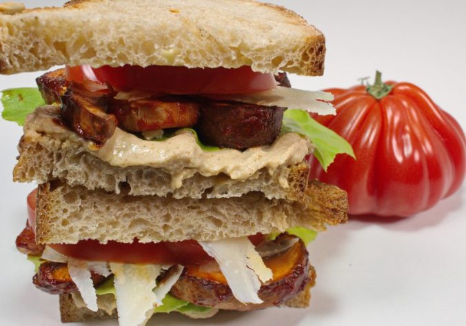 - In der Zwischenzeit das Brot toasten. Eine Scheibe mit dem Hummus und die andere mit der Knoblauchmayonnaise bestreichen. Für das Sandwich den Salat, die in Scheiben geschnittenen Tomaten und die gegrillten Pilze auf die Brotscheibe legen, mit Parmesan belegen und mit der zweiten Scheibe bedecken. Das Ganze für das zweite Sandwich wiederholen.