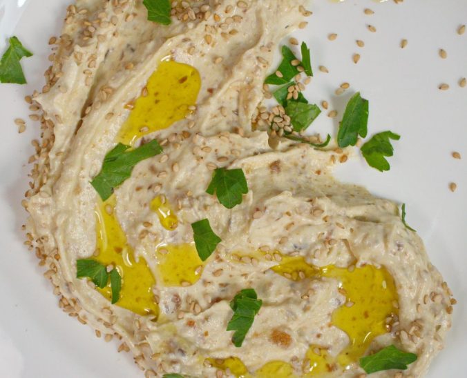 Den Dip vor dem Servieren nochmals abschmecken. Nach Belieben mit Petersilie, Sesamsamen und Olivenöl garnieren.